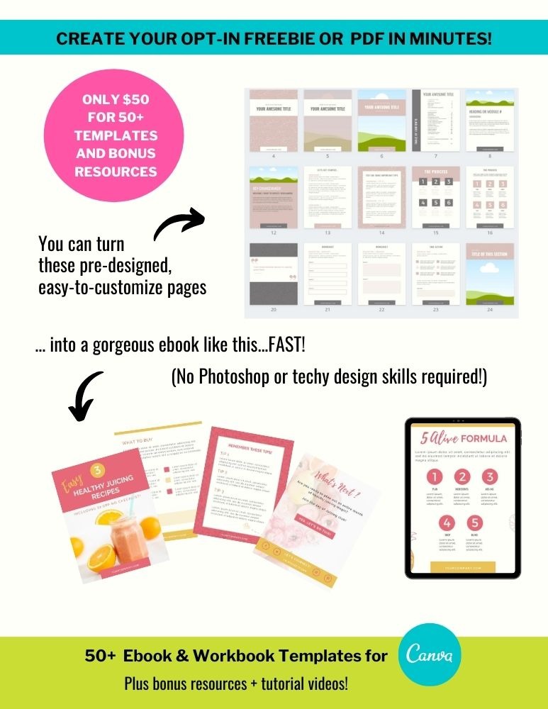Create your beautiful Opt-in Freebie or PDF in minutes! This easy to use customizable collection of 50+ pre-designed page templates will save you hours of time when you create your Ebooks, Guides, Workbooks, Worksheets, Checklists, or Resource Lists to use as freebies to grow your email list, or to accompany your webinar, course, or group coaching program. Graphic design newbie or not very techy? No problem! Canv...